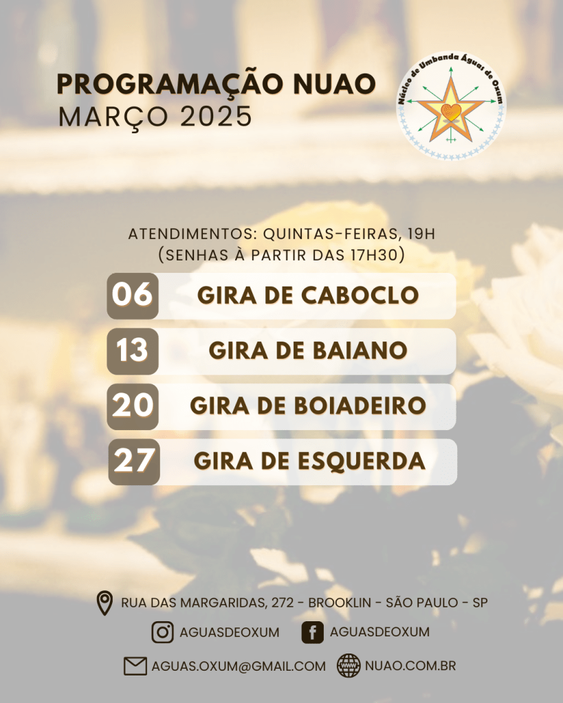 O Núcleo de Umbanda Águas de Oxumfoi fundado sob a regência de Mamãe Oxum e com a humildade e a sabedoria dos amados pretos-velhos. Membro da Associação Umbandista e Espiritualista do Estado de São Paulo (AUEESP), o núcleo é um local sagrado e caritativo, sustentado pelos pilares do amor, da fé, da caridade e da fraternidade, que juntos formam a sólida base de nossa religião: a Umbanda.